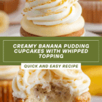 Keywords: banana pudding cupcakes, banana cupcakes, creamy banana dessert, cream cheese topping, easy banana cupcakes
