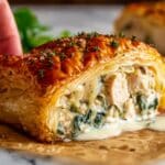 - Bake and Rest: Preheat the oven to 400°F (200°C). Place the wrapped chicken on a baking sheet and bake for 25 to 30 minutes until the pastry is golden brown and crisp. Remove from oven and let rest for 5 minutes before slicing and serving.