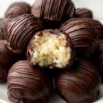 - Step 4: Insert a toothpick into the top center of each coconut ball, then dip it into the melted chocolate. Hold it over the cup to let excess chocolate drip off, then place it back on the lined cookie sheet. Remove the toothpick and use a teaspoon to dab a small amount of chocolate onto the top to cover the hole.