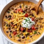 This creamy taco soup is a comforting and flavorful weeknight meal, combining seasoned ground beef, beans, corn, and a rich blend of cream cheese and heavy cream. Ready in just 30 minutes, it’s perfect for a cozy dinner, topped with your favorite garnishes like cheddar, sour cream, jalapeños, cilantro, lime, and tortilla chips.