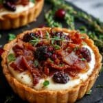 A delightful Cranberry Brie Tart featuring a flaky puff pastry base topped with creamy brie cheese, tart fresh cranberries, crispy pancetta, and fragrant thyme. Finished with a touch of honey or maple syrup for subtle sweetness, this tart balances savory and sweet flavors perfectly, making it a great appetizer or snack.