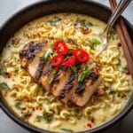 Keywords: Creamy garlic chicken ramen, spicy chicken ramen, creamy ramen recipe, homemade chicken ramen, easy ramen recipe, spicy garlic noodles, comfort food, Asian fusion dinner