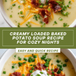 This Creamy Loaded Baked Potato Soup is a rich and comforting dish made with tender baked potatoes, crispy bacon, sharp cheddar cheese, and a creamy blend of milk and heavy cream. It’s the perfect hearty soup to warm you up on a chilly day, combining classic baked potato flavors in a smooth, velvety soup form.
