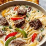 This Creamy Philly Cheese Steak Soup brings all the comforting flavors of a classic Philly cheesesteak into a rich, hearty bowl. Loaded with tender ribeye, melted provolone, and a smooth cheese-infused broth, it’s perfect for cozy evenings or entertaining guests.
