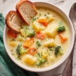 A rich and comforting creamy vegetable soup made with tender carrots, potatoes, broccoli, and sharp cheddar cheese, simmered to perfection in a flavorful vegetable broth and finished with a smooth milk and flour mixture for a velvety texture. Perfect for a hearty and warming meal.