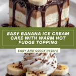 Keywords: Banana ice cream cake, frozen banana dessert, hot fudge topping, easy ice cream cake, summer dessert, make-ahead dessert