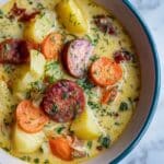 Keywords: German potato soup, kielbasa soup, creamy potato soup, hearty winter soup, one-pot soup, smoked sausage soup, comfort food