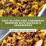 This easy, gluten-free Cornbread Dressing combines homemade cornbread cubes, savory Italian sausage, chewy dried cranberries, and crunchy pecans for a flavorful Southern Thanksgiving side dish. Baked to perfection, it offers a delightful twist on traditional dressing with herbs and spices enhancing every bite.