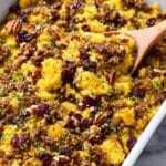 This easy, gluten-free Cornbread Dressing is a perfect twist on a classic Southern Thanksgiving side. Loaded with homemade cornbread, savory sausage, chewy cranberries, and crunchy pecans, it offers a delightful blend of flavors and textures that everyone will love.