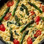 Healthy Baked Feta Orzo is a quick, comforting one-pan meal perfect for busy weeknights. This creamy, vegetable-packed pasta combines melty baked feta with fresh asparagus, tomatoes, and spinach for a deliciously simple dinner your whole family will love.