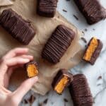 - Coat the Butterfingers: Dip each frozen log into the melted chocolate, allowing any excess chocolate to drip off. Lay the coated butterfingers back on the parchment-lined plate and freeze for about 10 minutes until the chocolate hardens.