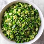 - Option 2 – Large Bowl Salad: In a large bowl, combine the chopped cucumber, celery, green peas, edamame, cooked quinoa, chopped spinach, cilantro, scallion, and toasted sesame seeds. Pour the prepared dressing over the salad and gently toss until everything is evenly coated. Add fresh lime juice to taste and serve immediately.