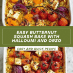 Keywords: butternut squash bake, vegetarian dinner, one-pan meal, roasted vegetables, halloumi, orzo bake, easy weeknight dinner, cozy fall recipe, meal prep, Mediterranean vegetarian