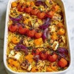 Keywords: butternut squash bake, vegetarian dinner, one-pan meal, roasted vegetables, halloumi, orzo bake, easy weeknight dinner, cozy fall recipe, meal prep, Mediterranean vegetarian