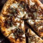Keywords: French onion pizza, caramelized onion pizza, Gruyere pizza, cheesy pizza, homemade pizza, cozy night recipe, comfort food, vegetarian pizza
