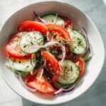 This refreshing Italian Cucumber Salad combines crisp cucumbers, juicy cherry tomatoes, and tangy red onion with a zesty red wine vinegar and oregano dressing. Perfect as a light side dish or a healthy snack, it’s quick to prepare and bursting with fresh Mediterranean flavors.