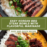 Delicious Korean BBQ Steak Bowls featuring marinated flank steak seared to perfection and served over jasmine or brown rice with fresh vegetables, toasted sesame seeds, and optional toppings like fried egg and avocado. This savory and flavorful dish combines sweet, savory, and spicy elements for an easy, satisfying meal.