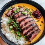 - Slice and Assemble: Slice the rested steak thinly against the grain. In each serving bowl, layer cooked rice, your choice of vegetables, and sliced steak. Drizzle with the prepared glaze, sprinkle with toasted sesame seeds and additional green onions, and add optional toppings such as a fried egg, sliced avocado, or sriracha mayo. Serve immediately.