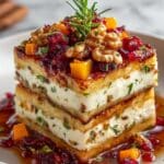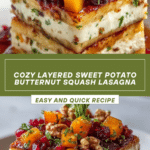 This layered sweet potato, butternut squash, and carrot lasagna is a colorful and flavorful vegetarian dish that brings warmth and comfort to any table. Roasted vegetables layered with creamy feta and crunchy walnuts, finished with a tangy cranberry glaze, make this recipe a delightful twist on traditional lasagna.