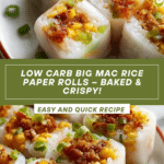 These Low Carb Baked Big Mac Rice Paper Rolls capture all the flavors of the iconic Big Mac in a healthier, crispier, and fun new form. Made with seasoned ground beef, melted cheddar, crunchy pickles, and shredded lettuce wrapped in rice paper and baked to golden perfection, they’re a nostalgic treat with a fresh twist.