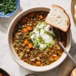 Keywords: Mediterranean lentil soup, lentil soup recipe, vegetarian soup, healthy soup, preserved lemon soup, herb oil, yogurt sauce