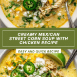 This Mexican Street Corn Soup is a creamy, flavorful bowl of comfort inspired by the beloved street food, elote. Featuring juicy chicken breasts, fire-roasted corn, smoky spices, and a tangy mixture of sour cream and cheese, this soup is rich and satisfying with a hint of lime and fresh cilantro. Perfect for a cozy dinner that delivers bold Mexican flavors in every spoonful.