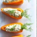 - Garnish: Pull off a few dill fronds or carrot stems and gently press the ends into the top of the filled peppers to resemble carrot leaves. The cream cheese filling will hold the stems securely in place.