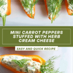 These mini “carrot” peppers stuffed with herb cream cheese make a delightful, colorful appetizer perfect for any gathering. The bright orange peppers mimic carrots, topped with fresh herb leaves for a charming presentation. Ready in just 10 minutes, they’re fresh, creamy, and easy to make.