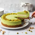 This no-bake pistachio cheesecake is a creamy, nutty delight that requires no oven time and little effort. Perfect for a special occasion or a refreshing treat, it combines a crunchy biscuit base, smooth pistachio filling, and a luscious white chocolate ganache topping.