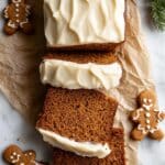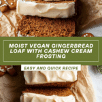 Keywords: vegan gingerbread loaf, gingerbread recipe, vegan baking, holiday baking, plant-based dessert, gingerbread with cream cheese frosting, dairy-free gingerbread
