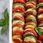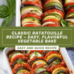 This Ratatouille recipe is a visually stunning and flavorful French vegetable dish featuring layers of sliced zucchini, eggplant, onions, and tomatoes baked in a herbed tomato sauce. Perfect as a healthy main or side, it combines fresh garden vegetables with aromatic herbs like basil and herbs de Provence for a comforting, tender, and elegantly presented meal.