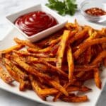 Crispy and flavorful Oven Roasted Sweet Potato Fries made with a perfect blend of spices and a light cornstarch coating for extra crunch. These fries are soaked to remove excess starch, tossed with olive oil and spice mix, then baked to golden perfection for a healthy and delicious side dish.