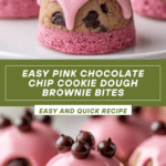 Pink Chocolate Chip Cookie Dough Brownie Bites are a playful and rich layered dessert featuring a fudgy chocolate brownie base topped with a creamy, sweet, pink cookie dough layer studded with mini chocolate chips. Perfectly sized for parties and celebrations, these bite-sized treats offer delightful textures and vibrant color, making them a crowd-pleasing dessert that’s easy to prepare ahead and customize.