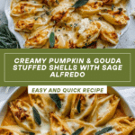 Pumpkin & Gouda Stuffed Shells with Brown Butter & Sage Alfredo Sauce is a comforting, savory pasta dish perfect for fall. Jumbo pasta shells are filled with a creamy mixture of ricotta, pumpkin puree, gouda cheese, garlic, sautéed onions, and spices, then baked in a rich brown butter and fresh sage alfredo sauce. This easy make-ahead meal combines seasonal flavors and creamy textures for a delicious, meat-free main course ideal for holiday dinners or cozy weeknights.