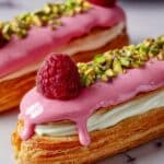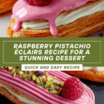 Raspberry Pistachio Éclairs are a delightful twist on the classic French pastry, combining the lightness of choux dough with a luscious raspberry cream filling and crunchy pistachios. Finished with a white chocolate drizzle, these éclairs make an elegant dessert perfect for any occasion.