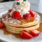 Celebrate the holiday season with these charming Santa Hat Strawberry Pancakes. Fluffy, golden pancakes stacked high and topped with fresh strawberries and whipped cream create a festive and delightful breakfast treat perfect for spreading holiday cheer.