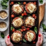 Sheet Pan Mushroom Parmigiana is a simple, flavorful dish that brings the comfort of classic Italian flavors to your weeknight dinner. Juicy roasted tomatoes and tender portobello mushrooms are topped with marinara, gooey mozzarella, and a crispy garlic breadcrumb crust. It’s easy to prepare and perfect for sharing.