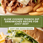 Slow Cooker French Dip Sandwiches are a delicious and effortless meal perfect for any night of the week. Tender chuck roast cooked low and slow with onions and spices creates juicy, flavorful beef that melts in your mouth. Serve on crusty bread with melted cheese and a side of savory au jus for dipping.