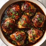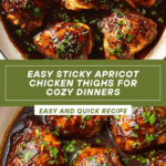 This Sticky Apricot Chicken Thighs Recipe features tender, bone-in, skin-on chicken thighs with a crispy golden skin glazed in a sweet and savory sticky apricot sauce. Made with simple pantry ingredients such as apricot jam, soy sauce, and garlic, this dish is perfect for a cozy weeknight dinner. The chicken is pan-seared for crispiness, then simmered gently in a homemade glaze until perfectly sticky and flavorful. Serve it over rice or mashed potatoes to soak up the delicious sauce.