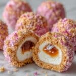 - Coat with Crunchy Topping: Roll each chilled cheesecake ball in the prepared strawberry crunch topping, gently pressing to ensure it adheres to the surface.