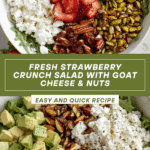 This vibrant Strawberry Crunch Salad combines peppery arugula, sweet strawberries, creamy avocado, and tangy goat cheese, topped with crunchy sugared almonds and pistachios. A bright champagne vinaigrette ties all the flavors together, making it a refreshing and elegant salad perfect for spring or summer meals.