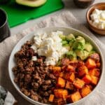 PrintSweet Potato Beef Bowl with Hot Honey and Cottage Cheese Recipe