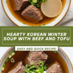 Nothing beats a steaming bowl of Korean winter soup on a cold night. This hearty dish combines tender beef, soft tofu, and aromatic vegetables in a rich, savory broth that warms you from the inside out. Perfect for cozy evenings, it’s sure to become a family favorite.