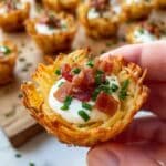 - Garnish and serve: Top the loaded tater tot cups with a dollop of sour cream, crumbled bacon, and sliced green onions. Serve warm to enjoy the crispy, cheesy appetizer cups at their best.