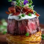 - Assemble the dish: Place one potato crisp on each serving plate. Top each crisp with a seared beef cube. Add a dollop of the chilled horseradish cream on top of the beef. Garnish with chive blossoms or chopped chives and a few sprigs of micro-greens for freshness and visual appeal.