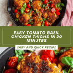Keywords: chicken thighs, tomato basil chicken, skillet chicken recipe, easy chicken dinner, garlic chicken, basil tomato sauce
