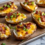 - Refill Potato Skins and Bake Again: Spoon the creamy potato mixture evenly back into the potato skins, filling each generously. Sprinkle the remaining cheddar cheese (½ cup) on top of each filled potato half. Return the potatoes to the oven and bake at 350°F (175°C) for an additional 15 minutes, until the cheese is melted and lightly browned.