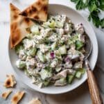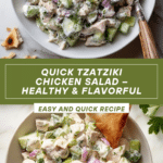 Keywords: tzatziki chicken salad, Greek yogurt chicken salad, healthy chicken salad, Mediterranean chicken salad, no-cook chicken recipe