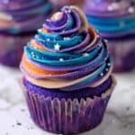 These whimsical Unicorn Cupcakes feature a moist, fluffy vanilla base delicately infused with purple gel food color for a magical hue. Topped with vibrant, multi-colored swirl buttercream frosting, these cupcakes are perfect for parties, celebrations, or any time you want to add a touch of fantasy to your dessert table. The buttercream is divided into four vibrant colors—purple, blue, orange, and pink—that are layered and piped to create a beautiful, festive look.