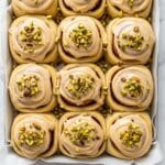 - Glaze: Whisk powdered sugar, pistachio butter, vanilla extract, and non-dairy milk until smooth. Drizzle or swirl on top of warm rolls before serving.